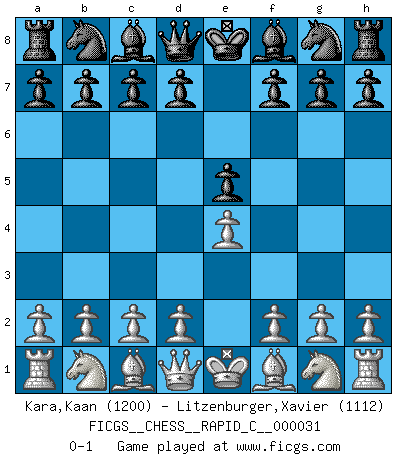 Last move : 0-1 2007 June 11 19:8:8 [Event "FICGS__CHESS__RAPID_C__000031"] [Site "FICGS"] [Date "2007.05.11"] [Round "1"] [White "Kara,Kaan"] [Black "Litzenburger,Xavier"] [Result "0-1"] [WhiteElo "1200"] [BlackElo "1112"] 1.e4 e5 0-1 This chess game has been lost on time (started : 2007.05.11 13:6:56) King's pawn game Player Black won this chess game. Follow this game move after move (download)Chess is a cold bath for the mind. (Sir John Simon) Wie kann ich Remis annehmen? Ich weiß ja gar nicht, wie ich stehe! (Fritz Sämisch) El Ajedrez es el juego mas altamente simbólico, pero las agresiones estan por lo tanto aún mas francamente representadas en la partida. Tal vez comenzo como un juego de guerra; Algo como la representación de una batalla en miniatura entre las fuerzas de dos reinos. (Karl Meninger) Il vaut toujours mieux jouer un plan faux de façon logique que de n'avoir pas de plan du tout. (Victor Kortchnoï) The real danger is not that computers will begin to think like men, but that men will begin to think like computers. (Sydney J. Harris)