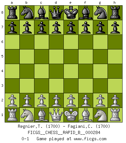 Last move : 0-1 2018 July 19 20:7:4 [Event "FICGS__CHESS__RAPID_B__000284"] [Site "FICGS"] [Date "2018.06.19"] [Round "1"] [White "Regnier,Thomas"] [Black "Fagiani,Carlos Junior"] [Result "0-1"] [WhiteElo "1700"] [BlackElo "1700"] 0-1 This chess game has been lost on time (started : 2018.06.19 15:7:5) Player Black won this chess game. Follow this game move after move (download)Chess is a part of culture and if a culture is declining then Chess too will decline. (Mikhail Botvinnik) Das Schachspiel hat wie die Liebe, die Musik, die Fähigkeit, den Menschen glücklich zu machen. Ich habe ein leises Gefühl des Bedauerns für jeden, der das Schachspiel nicht kennt, so wie ich jeden bedaure, der die Liebe nicht kennt. (Siegbert Tarrasch) El Ajedrez es tan inspirador que yo no creo que un buen jugador sea capaz de tener un pensamiento malo durante una partida. (Wilhelm Steinitz) J'apprécie les joueurs d'est-indienne, c'est grâce à eux que je nourris ma famille depuis tant d'années. (Petrosian) A generalist learns less and less about more and more until he knows nothing about everything. (Author unknown)