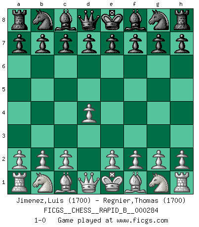 Last move : 1-0 2018 July 27 20:36:55 [Event "FICGS__CHESS__RAPID_B__000284"] [Site "FICGS"] [Date "2018.06.19"] [Round "1"] [White "Jimenez,Luis"] [Black "Regnier,Thomas"] [Result "1-0"] [WhiteElo "1700"] [BlackElo "1700"] 1.d4 1-0 This chess game has been lost on time (started : 2018.06.19 15:7:5) Queen's pawn Player White won this chess game. Follow this game move after move (download)Every Chess master was once a beginner. (Chernev) Ein Gewinn durch eine ungenaue Kombination, sei sie auch noch so vorzeigbar, erfüllt mich mit Schaudern. (Wilhelm Steinitz) Solo los afeminados hacen el Enroque. (Rob Sillars) Votre seul travail dans les ouvertures est d'obtenir un milieu de partie jouable. (Lajos Portish) An expert is a man who has made all the mistakes which can be made in a very narrow field. (Niels Bohr)