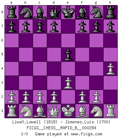 Last move : 1-0 2018 July 21 8:6:14 [Event "FICGS__CHESS__RAPID_B__000284"] [Site "FICGS"] [Date "2018.06.19"] [Round "1"] [White "Liwat,Lowell"] [Black "Jimenez,Luis"] [Result "1-0"] [WhiteElo "1818"] [BlackElo "1700"] 1.h4 e5 2.e3 1-0 This chess game has been lost on time (started : 2018.06.19 15:7:5) Anti-Borg (Desprez) Opening Player White won this chess game. Follow this game move after move (download)In blitz, the Knight is stronger than the Bishop. (Vlastimil Hort) Ich spiele ehrlich und spiele, um zu gewinnen. Wenn ich verliere nehme ich meine Medizin. (Robert James Fischer) Bobby es la celebridad menos entendida y malinterpretada que camina el la faz de esta tierra. (Yasser Seirawan) La solitude du joueur d'Echecs à l'approche du mat est semblable à celle du condamné. (Francis Szpiner) Dave, my mind is going. I can feel it. (HAL 9000 in 2001, a space odyssey)