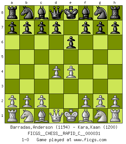 Last move : 1-0 2007 June 11 19:8:8 [Event "FICGS__CHESS__RAPID_C__000031"] [Site "FICGS"] [Date "2007.05.11"] [Round "1"] [White "Barradas,Anderson"] [Black "Kara,Kaan"] [Result "1-0"] [WhiteElo "1194"] [BlackElo "1200"] 1.e4 e6 2.d4 1-0 This chess game has been lost on time (started : 2007.05.11 13:6:56) French defense Player White won this chess game. Follow this game move after move (download)If one piece is badly posted, the whole game is bad. (Tarrasch) Vielleicht wirkt die Aura früherer Spieler glanzvoller als die der heutigen Spieler, aber das liegt daran, dass man kein Programm wie Fritz hatte, das einem all die Löcher in ihren Partien zeigt. (Vladimir Kramnik) Después de una mala apertura, hay una esperanza en el juego medio. Pero una vez que estas en finales, el momento de la verdad ha llegado. (Edmar Mednis) Vouloir jouer aux échecs contre soi-même est aussi paradoxal que vouloir marcher sur son ombre. (Stefan Zweig) Just because you do not take an interest in politics doesn't mean politics won't take an interest in you. (Pericles 430 B.C.)