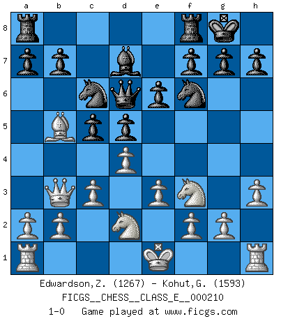 Last move : 1-0 2018 August 18 10:48:25 [Event "FICGS__CHESS__CLASS_E__000210"] [Site "FICGS"] [Date "2018.06.19"] [Round "1"] [White "Edwardson,Zachariah"] [Black "Kohut,Gregory"] [Result "1-0"] [WhiteElo "1267"] [BlackElo "1593"] 1.d4 Nf6 2.Nf3 e6 3.Bf4 d5 4.e3 c5 5.c3 Nc6 6.h3 Bd6 7.Bxd6 Qxd6 8.Nbd2 O-O 9.Bb5 Bd7 10.Qb3 1-0 This chess game has been lost on time (started : 2018.06.19 23:17:30) Queen's pawn game Kingside Castling by player Black (move 8) Player White won this chess game. Follow this game move after move (download)I know people who have all the will in the world, but still can't play good Chess. (Bobby Fischer) Die Elozahlen sind sehr schlecht für das Schach. Jetzt ist Schach eine Sportindustrie, die darauf zielt Elopunkte zu machen. (Miguel Najdorf) El estómago es una parte esencial del maestro de Ajedrez. (Bent Larsen) On n'a jamais que l'âge auquel on a commence à jouer aux échecs car après on cesse de vieillir. (Capablanca) The Internet is the world's largest library. It's just that all the books are on the floor. (John Allen Paulos)