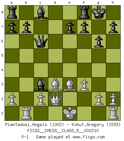 Last move : 0-1 2018 September 4 23:44:23 [Event "FICGS__CHESS__CLASS_E__000210"] [Site "FICGS"] [Date "2018.06.19"] [Round "1"] [White "Piantadosi,Angelo"] [Black "Kohut,Gregory"] [Result "0-1"] [WhiteElo "1302"] [BlackElo "1593"] 1.e4 c5 2.Nf3 Nc6 3.d4 cxd4 4.Nxd4 g6 5.Nc3 Bg7 6.Be3 Nf6 7.f3 O-O 8.Qd2 d5 9.exd5 Nxd5 10.Nxd5 Qxd5 11.Nxc6 Qxc6 12.Bd3 Bxb2 13.Rb1 Bc3 0-1 Sicilian : Accelerated Fianchetto, Modern variation Kingside Castling by player Black (move 7) Player Black won this chess game. Follow this game move after move (download)Chess makes man wiser and clear-sighted. (Vladimir Putin) Die starken Figuren des Gegners muss man abtauschen. (José Raúl Capablanca) No todos los artistas son jugadores de Ajedrez, pero todos los jugadores de Ajedrez son artistas. (Marcel Duchamp) Si rien de grave n'est détecté lors de l'analyse d'une position, on joue alors le coup. Seconde règle de Blumenfeld. Even the best needles are not sharp at both ends. (Chinese proverb)