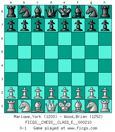 Last move : 0-1 2018 July 30 8:46:10 [Event "FICGS__CHESS__CLASS_E__000210"] [Site "FICGS"] [Date "2018.06.19"] [Round "1"] [White "Marlowe,York"] [Black "Wood,Brian"] [Result "0-1"] [WhiteElo "1200"] [BlackElo "1252"] 0-1 This chess game has been lost on time (started : 2018.06.19 23:17:30) Player Black won this chess game. Follow this game move after move (download)Bobby is the finest Chess player this country ever produced. His memory for the moves, his brilliance in dreaming up combinations, and his fierce determination to win are uncanny. (John Collins) Nur ein wirklich starker Spieler weiß wie schwach er spielt. (Savielly Grigorievitsch Tartakower) Es el objetivo de la escuela moderna no tratar cada posición de acuerdo a una regla general, sino de acuerdo al principio inherente en la posición. (Richard Reti) Plusieurs personnes se sont demandées comment Tal faisait pour gagner... En fait, c'est très simple ! Il met ses pièces au centre de l'échiquier et les sacrifie quelque part ! (David Bronstein) See no evil, hear no evil, speak no evil. (The 3 monkeys)
