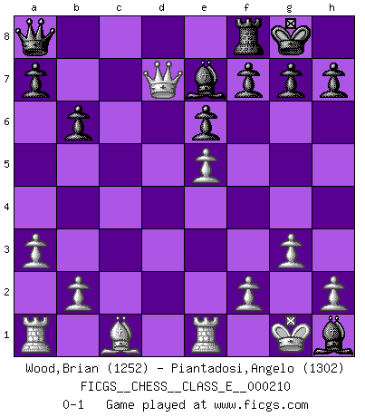 Last move : 0-1 2018 July 24 1:23:13 [Event "FICGS__CHESS__CLASS_E__000210"] [Site "FICGS"] [Date "2018.06.19"] [Round "1"] [White "Wood,Brian"] [Black "Piantadosi,Angelo"] [Result "0-1"] [WhiteElo "1252"] [BlackElo "1302"] 1.Nf3 d5 2.g3 c5 3.Bg2 Nc6 4.d3 Nf6 5.Nbd2 e6 6.O-O Be7 7.e4 dxe4 8.dxe4 O-O 9.Re1 b6 10.e5 Nd7 11.Nd4 Nxd4 12.Bxa8 Ba6 13.c3 Qxa8 14.cxd4 cxd4 15.a3 Bd3 16.Nf3 Be4 17.Qxd4 Bxf3 18.Qxd7 Bh1 0-1 Reti : King's Indian attack Kingside Castling by player White (move 6) Kingside Castling by player Black (move 8) Player Black won this chess game. Follow this game move after move (download)The most powerful weapon in Chess is to have the next move. (David Bronstein) Ich bin es gewohnt, das die Jugend mir überhaupt keinen Respekt entgegenbringt. (Alexander Morozewich) ¡Examina movidas que hagan daño! Un buen ojo for movidas desvastantes es mucho mas importante que el conocimiento de principios estratégicos. (Purdy) Aux échecs, l'amour-propre est satisfait quand on remporte la victoire, mais il n'y a pas de honte à être battu. (Benjamin Franklin) Drag your thoughts away from your troubles... by the ears, by the heels, or any other way you can manage it. (Mark Twain)
