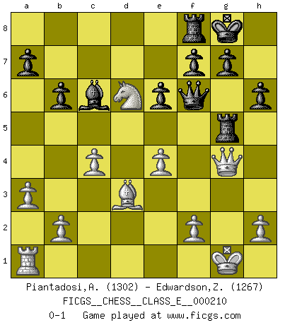 Last move : 0-1 2018 August 14 0:5:59 [Event "FICGS__CHESS__CLASS_E__000210"] [Site "FICGS"] [Date "2018.06.19"] [Round "1"] [White "Piantadosi,Angelo"] [Black "Edwardson,Zachariah"] [Result "0-1"] [WhiteElo "1302"] [BlackElo "1267"] 1.d4 Nf6 2.c4 e6 3.Nc3 Bb4 4.Qc2 O-O 5.a3 Bxc3+ 6.Qxc3 b6 7.Bg5 Bb7 8.Nf3 d6 9.e3 Nbd7 10.Bd3 c5 11.Qc2 h6 12.Bh4 cxd4 13.Nxd4 Bxg2 14.Rg1 Bb7 15.e4 Ne5 16.Bxf6 Qxf6 17.Qe2 Rac8 18.Nb5 Nf3+ 19.Kf1 Nxg1 20.Kxg1 Rc5 21.Nxd6 Bc6 22.Qg4 Rg5 0-1 Nimzo-Indian : Classical variation Kingside Castling by player Black (move 4) Player Black won this chess game. Follow this game move after move (download)Good offense and good defense both begin with good development. (Bruce A. Moon) Besser ein falscher Plan, logisch durchgeführt, als gar kein Plan. (Viktor Kortschnoi) Es muy difícil jugar en contra de la teoría de Einstein. - en su primera derrota en contra de Fischer (Mikhail Tal) Avant la finale, les dieux ont créé le milieu de partie. (Tarrasch) Patience, use the Force, think ! (Obi-Wan Kenobi in Star Wars ep.2)