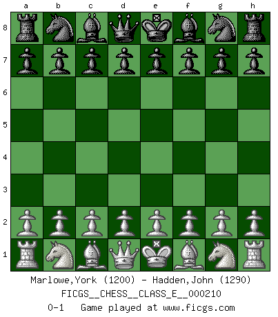 Last move : 0-1 2018 July 30 8:46:10 [Event "FICGS__CHESS__CLASS_E__000210"] [Site "FICGS"] [Date "2018.06.19"] [Round "1"] [White "Marlowe,York"] [Black "Hadden,John"] [Result "0-1"] [WhiteElo "1200"] [BlackElo "1290"] 0-1 This chess game has been lost on time (started : 2018.06.19 23:17:30) Player Black won this chess game. Follow this game move after move (download)First-class players lose to second class players because second-class players sometimes play a first-class game. (Tarrasch) Ivan Sokolov treibt mich als Beifahrer an mit go Loeky go - . (Loek van Wely) Bobby Fischer es el mas grande genio de Ajedrez de todos los tiempos. (Alexander Kotov) Les Echecs sont et restent toujours un combat, un combat intégral comme la boxe, la lutte ou un autre sport, et où il doit y avoir un vainqueur et un vaincu. (Joseph Emil Diemer) 98% of all statistics are made up. (Author unknown)