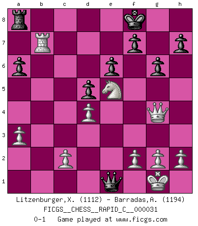 Last move : 0-1 2007 May 21 22:33:36 [Event "FICGS__CHESS__RAPID_C__000031"] [Site "FICGS"] [Date "2007.05.11"] [Round "1"] [White "Litzenburger,Xavier"] [Black "Barradas,Anderson"] [Result "0-1"] [WhiteElo "1112"] [BlackElo "1194"] 1.e4 c6 2.Nf3 d5 3.exd5 cxd5 4.d4 Nc6 5.Nc3 e6 6.Bb5 a6 7.Bxc6+ bxc6 8.Bf4 Bb4 9.O-O Nf6 10.a3 Bxc3 11.bxc3 Ne4 12.Ne5 Bb7 13.c4 O-O 14.cxd5 cxd5 15.Rb1 Nc3 16.Qg4 Nxb1 17.Rxb1 Qa5 18.Bh6 g6 19.Bxf8 Kxf8 20.Rxb7 Qe1+ 0-1 Caro-Kann defense Kingside Castling by player White (move 9) Kingside Castling by player Black (move 13) Player Black won this chess game. Follow this game move after move (download)Fischer was a master of clarity and a king of artful positioning. His opponents would see where he was going but were powerless to stop him. (Bruce Pandolfini) Frage des Reporters: -Worin besteht das Ziel von Gambiteröffnungen? Antwort: -Auf Kosten der Partie einen Ruf als Angriffspieler zu erwerben.- (Siegbert Tarrasch) Hay jugadores fuertes y personas amables y yo soy un jugador fuerte. (Bobby Fischer) Votre prénom est 'Tactique', votre deuxième prénom est 'Tactique' et votre nom est 'Tactique'. (Ken Smith) Creativity is allowing yourself to make mistakes. Art is knowing which ones to keep. (Scott Adams)