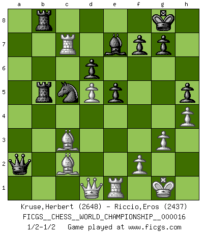 Last move : 1/2-1/2 2018 September 3 1:52:1 [Event "FICGS__CHESS__WORLD_CHAMPIONSHIP__000016"] [Site "FICGS"] [Date "2018.06.21"] [Round "2"] [White "Kruse,Herbert"] [Black "Riccio,Eros"] [Result "1/2-1/2"] [WhiteElo "2648"] [BlackElo "2437"] 1.Nf3 c5 2.e4 d6 3.d4 cxd4 4.Nxd4 Nf6 5.Nc3 a6 6.h3 e5 7.Nde2 h5 8.g3 Be6 9.Bg2 b5 10.a4 b4 11.Nd5 Nxd5 12.exd5 Bf5 13.c3 bxc3 14.Nxc3 Be7 15.O-O Qc8 16.h4 Nd7 17.Be3 Qb7 18.Rc1 Qxb2 19.Ne4 O-O 20.Rc6 Qb4 21.Bd2 Qa3 22.a5 Rab8 23.Re1 Rb3 24.Rxa6 Bxe4 25.Bc1 Qa2 26.Bxe4 Nc5 27.Rc6 Rb5 28.Bc2 Rxa5 29.Bd2 Rb5 30.Bc3 Rfb8 31.Rc7 1/2-1/2 Reti Opening Kingside Castling by player White (move 15) Kingside Castling by player Black (move 19) This chess game ended in a draw. Follow this game move after move (download)Is Bobby Fischer quite sane ? (Salo Flohr) Stil? Ich habe keinen Stil! (Anatoly Karpov) Buenas posiciones no logran ganar juegos, buenas movidas sí. (Gerald Abrahams) Un millionnaire : 'Monsieur Steinitz ! Vous ne participez aux tournois que pour l'argent, alors que moi je n'y viens que pour l'honneur.' Steinitz : 'Chacun joue pour ce qu'il n'a pas'... Everything in life is luck. (Donald Trump)