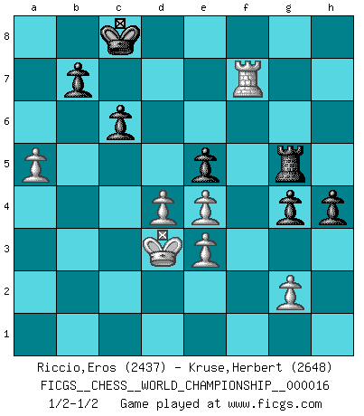 Last move : 1/2-1/2 2018 September 3 1:52:8 [Event "FICGS__CHESS__WORLD_CHAMPIONSHIP__000016"] [Site "FICGS"] [Date "2018.06.21"] [Round "3"] [White "Riccio,Eros"] [Black "Kruse,Herbert"] [Result "1/2-1/2"] [WhiteElo "2437"] [BlackElo "2648"] 1.e4 e5 2.Nf3 Nc6 3.Bc4 Nf6 4.d3 Bc5 5.O-O d6 6.c3 O-O 7.Bg5 h6 8.Bh4 g5 9.Bg3 a6 10.Bb3 Ba7 11.Nbd2 Na5 12.Bc2 Nh5 13.b4 Nxg3 14.hxg3 Nc6 15.Nc4 g4 16.Nh4 Qg5 17.Qe2 Ne7 18.Ne3 Be6 19.Bb3 h5 20.Rad1 Rad8 21.Qd2 Bxe3 22.fxe3 c6 23.Rde1 Ng6 24.Qf2 Nxh4 25.gxh4 Qg6 26.Qf6 Rde8 27.Bxe6 Rxe6 28.Qxg6+ fxg6 29.a4 Ref6 30.Rxf6 Rxf6 31.c4 Rf7 32.d4 Kg7 33.c5 a5 34.cxd6 axb4 35.Rb1 Kf6 36.Rxb4 Ke6 37.d7 Rxd7 38.Kf2 Kd6 39.a5 Re7 40.Rb2 Rg7 41.Ke2 g5 42.hxg5 h4 43.Kd3 Kc7 44.Rf2 Rxg5 45.Rf7+ Kc8 46.Rf8+ Kc7 47.Rf7+ Kc8 1/2-1/2 Two knights defense (Modern Bishop's Opening) Kingside Castling by player White (move 5) Kingside Castling by player Black (move 6) This chess game ended in a draw. Follow this game move after move (download)In life, as in Chess, one's own Pawns block one's way. A man's very wealth, ease, leisure, children, books, which should help him to win, more often checkmate him. (Charles Buxton) Ich habe Putins Aufstieg an die Macht beobachtet und seine Politik, die demokratischen Institutionen meines Landes zu zerstören. (Garry Kasparov) Juega la Apertura como un libro, el Juego Medio como un mago y los Finales como una máquina. (Spielmann) Avec des compensations pour le matériel en plus... (Anonyme) Perhaps the current trend of many chess professionals taking up the more lucrative pastime of poker is not a wholly negative one. It may not be too late for humans to relearn how to take risks in order to innovate and thereby maintain the advanced lifestyles we enjoy. And if it takes a poker-playing supercomputer to remind us that we can't enjoy the rewards without taking the risks, so be it. (The Chess Master and the Computer, by Garry Kasparov - 2010)