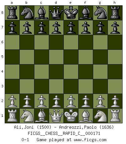 Last move : 0-1 2018 July 22 8:11:52 [Event "FICGS__CHESS__RAPID_C__000171"] [Site "FICGS"] [Date "2018.06.21"] [Round "1"] [White "Ali,Joni"] [Black "Andreozzi,Paolo"] [Result "0-1"] [WhiteElo "1500"] [BlackElo "1636"] 0-1 This chess game has been lost on time (started : 2018.06.21 21:13:16) Player Black won this chess game. Follow this game move after move (download)Place the contents of the Chess box in a hat, shake them up vigorously, pour them on the board from a height of two feet, and you get the style of Steinitz. (H. E. Bird) Spiel ein langweiliges Spiel zu Ende und lustige Dinge können passieren. (Hans Ree) Si yo gano un torneo, yo lo gano por mí mismo. Yo hago las jugadas. Nadie me ayuda. (Bobby Fischer) Les échecs, c'est l'art d'analyser. (Mikhail Botvinnik) See no evil, hear no evil, speak no evil. (The 3 monkeys)