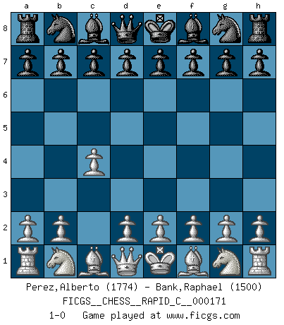 Last move : 1-0 2018 July 22 20:17:6 [Event "FICGS__CHESS__RAPID_C__000171"] [Site "FICGS"] [Date "2018.06.21"] [Round "1"] [White "Perez,Alberto"] [Black "Bank,Raphael"] [Result "1-0"] [WhiteElo "1774"] [BlackElo "1500"] 1.c4 1-0 This chess game has been lost on time (started : 2018.06.21 21:13:16) English Opening Player White won this chess game. Follow this game move after move (download)You sit at the board and suddenly your heart leaps. Your hand trembles to pick up the piece and move it. But what Chess teaches you is that you must sit there calmly and think about whether it's really a good idea and whether there are other better ideas. (Stanley Kubrick) Schach ist ein schwarz-weisser Dschungel. (Garry Kasparov) ¿Cual es el objetivo de jugar una apertura de gambito?... Para adquirir una reputación de ser un jugador apuesto a costo de perder el juego. (Siegbert Tarrasch) Ce n'est pas pour s'amuser qu'il joue aux échecs : il célèbre un culte. (Vladimir Nabokov) How many people work in NATO Headquarters ? - About half of them. (Dirk Stikker, NATO general secretary)