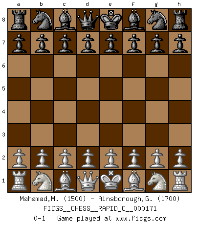 Last move : 0-1 2018 July 22 8:11:52 [Event "FICGS__CHESS__RAPID_C__000171"] [Site "FICGS"] [Date "2018.06.21"] [Round "1"] [White "Mahamad,Moussa"] [Black "Ainsborough,Gregory"] [Result "0-1"] [WhiteElo "1500"] [BlackElo "1700"] 0-1 This chess game has been lost on time (started : 2018.06.21 21:13:16) Player Black won this chess game. Follow this game move after move (download)Fischer Chess play was always razor-sharp, rational and brilliant. One of the best ever. (Dave Regis) Ich verachte die Medien. (Robert James Fischer) Morphy probablemente fue el genio más grande de todos. (Bobby Fischer) La guerre est enfant de la passion, la passion est enfant du narcissisme et le narcissisme est l'enfant. (...) Une autre partie ? (Thibault de Vassal) The next best thing to gambling and winning is gambling and loosing. (Nick Dandalos)