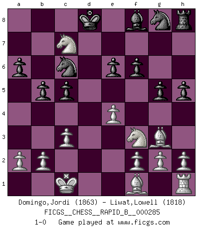 Last move : 1-0 2018 July 3 0:23:25 [Event "FICGS__CHESS__RAPID_B__000285"] [Site "FICGS"] [Date "2018.06.22"] [Round "1"] [White "Domingo,Jordi"] [Black "Liwat,Lowell"] [Result "1-0"] [WhiteElo "1863"] [BlackElo "1818"] 1.e4 c5 2.Nf3 a6 3.c3 Nc6 4.d4 e6 5.d5 Nce7 6.dxe6 dxe6 7.Qxd8+ Kxd8 8.Na3 Nc6 9.Bf4 f6 10.O-O-O Bd7 11.Nc4 b5 12.Rxd7+ Kxd7 13.Nb6+ Kd8 14.Nxa8 g5 15.Bg3 h5 16.Nc7 1-0 Comment by player 2 : Lowell Liwat : Congrats Sicilian : O'Kelly variation Queenside Castling by player White (move 10) Player White won this chess game. Follow this game move after move (download)If I win a tournament, I win it by myself. I do the playing. Nobody helps me. (Bobby Fischer) Es hat in meinem Leben Zeiten gegeben, da ich sehr nahe daran war zu glauben, daß ich auch nicht eine einzige Schachpartie verlieren könnte. (José Raúl Capablanca) En manos de Fischer's, una diminuta ventaja teórica es tan buena como tener una Reina de ventaja. (Isaac Kashdan) Le jeu d'échecs est comme rejeté hors du temps. (Antoine de Saint-Exupéry) For to win one hundred victories in one hundred battles is not the acme of skill. To subdue the enemy without fighting is the acme of skill. (Sun Tzu)