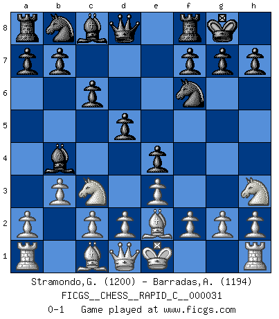 Last move : 0-1 2007 June 23 14:35:14 [Event "FICGS__CHESS__RAPID_C__000031"] [Site "FICGS"] [Date "2007.05.11"] [Round "1"] [White "Stramondo,Giulio"] [Black "Barradas,Anderson"] [Result "0-1"] [WhiteElo "1200"] [BlackElo "1194"] 1.e3 e5 2.b3 d5 3.Nc3 Bb4 4.Bb5+ c6 5.Bd3 e4 6.Be2 Nf6 7.Nh3 O-O 0-1 This chess game has been lost on time (started : 2007.05.11 13:6:56) Van't Kruijs Opening Kingside Castling by player Black (move 7) Player Black won this chess game. Follow this game move after move (download)Everything is in a state of flux, and this includes the world of Chess. (Mikhail Botvinnik) Ich brauche nur einen Blick auf das Schachbrett zu werfen, und weiß schon, was in der Stellung steckt, was geschehen kann und was geschehen wird. Alle übrigen suchen und prüfen, ich aber weiß es! (José Raúl Capablanca) En manos de Fischer's, una diminuta ventaja teórica es tan buena como tener una Reina de ventaja. (Isaac Kashdan) Le jeu d'échecs est comme rejeté hors du temps. (Antoine de Saint-Exupéry) If you know the enemy and know yourself you need not fear the results of a hundred battles. (Sun Tzu)