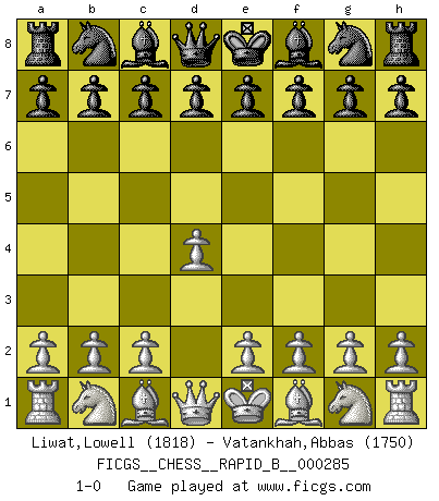 Last move : 1-0 2018 July 23 8:18:5 [Event "FICGS__CHESS__RAPID_B__000285"] [Site "FICGS"] [Date "2018.06.22"] [Round "1"] [White "Liwat,Lowell"] [Black "Vatankhah,Abbas"] [Result "1-0"] [WhiteElo "1818"] [BlackElo "1750"] 1.d4 1-0 This chess game has been lost on time (started : 2018.06.22 22:27:14) Queen's pawn Player White won this chess game. Follow this game move after move (download)I prefer to lose a really good game than to win a bad one. (David Levy) Jede Eröffnung ist gut genug um gespielt zu werden, wenn nur ihr Ruf schlecht genug ist. (Savielly Grigorievitsch Tartakower) El Ajedrez es sobre todo, ¡una pelea!. (Emanuel Lasker) Il a essayé de se convaincre qu'il pourrait empêcher toutes les erreurs et ne jamais perdre. L'horreur ! Gary Kasparov au sujet de Robert Fischer. There are two types of people in this world, good and bad. The good sleep better, but the bad seem to enjoy the waking hours much more. (Woody Allen)