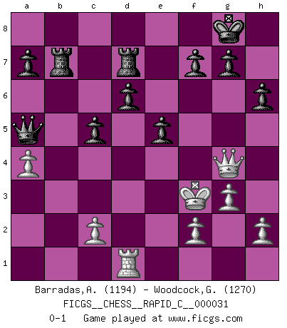Last move : 0-1 2007 July 12 16:7:56 [Event "FICGS__CHESS__RAPID_C__000031"] [Site "FICGS"] [Date "2007.05.11"] [Round "1"] [White "Barradas,Anderson"] [Black "Woodcock,Graham"] [Result "0-1"] [WhiteElo "1194"] [BlackElo "1270"] 1.e4 c5 2.Nf3 Nc6 3.d4 cxd4 4.Nxd4 Nf6 5.Nc3 Qa5 6.Nxc6 bxc6 7.Bd2 e5 8.a3 Qb6 9.Be3 Qxb2 10.Na4 Qb8 11.Rb1 Bb7 12.Nc5 Bxc5 13.Bxc5 Nxe4 14.Be3 Nc3 15.Qc1 Nxb1 16.Qxb1 Qc7 17.Bc5 Rb8 18.Be2 Ba6 19.Qa2 Bxe2 20.Kxe2 d6 21.Bb4 O-O 22.Rd1 c5 23.Qc4 Rb7 24.Bc3 Qc6 25.g3 h6 26.a4 Rd8 27.Ba5 R8d7 28.Qg4 Qa6+ 29.Kf3 Qxa5 0-1 Sicilian defense Kingside Castling by player Black (move 21) Player Black won this chess game. Follow this game move after move (download)I played Chess with him and would have beaten him sometimes only he always took back his last move, and ran the game out differently. (Mark Twain) Wie bekannt hörte Morphy 1859 auf, Schach zu spielen. Seine Enttäuschung galt nicht so sehr dem Schach, wie den Schachspielern. (Robert James Fischer) El Ajedrez no es como la vida... ¡tiene reglas!. (Mark Pasternak) On peut tirer plus d'utilité d'une partie perdue que de 100 parties gagnées. (Capablanca) If you have any trouble condescending, find a Unix user to show you how it's done. (Scott Adams)