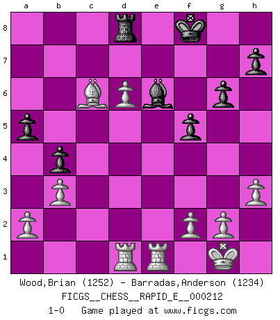 Last move : 1-0 2018 September 23 21:46:12 [Event "FICGS__CHESS__RAPID_E__000212"] [Site "FICGS"] [Date "2018.06.24"] [Round "1"] [White "Wood,Brian"] [Black "Barradas,Anderson"] [Result "1-0"] [WhiteElo "1252"] [BlackElo "1234"] 1.d4 d5 2.Nf3 Nf6 3.Bf4 g6 4.e3 Bg7 5.c4 O-O 6.Nc3 c6 7.h3 a6 8.c5 b5 9.Bxb8 Rxb8 10.Ne5 Qc7 11.Bd3 b4 12.Ne2 Nh5 13.O-O Bxe5 14.dxe5 Qxe5 15.Nd4 Nf4 16.Nxc6 Qg5 17.exf4 Qxf4 18.Nxb8 Qxb8 19.b3 a5 20.Re1 e5 21.Rc1 e4 22.Bb1 Qf4 23.Qxd5 Re8 24.Bxe4 Be6 25.Qc6 Kf8 26.Qd6+ Qxd6 27.cxd6 Rd8 28.Rcd1 f5 29.Bc6 1-0 Queen's Bishop game Kingside Castling by player Black (move 5) Kingside Castling by player White (move 13) Player White won this chess game. Follow this game move after move (download)I had a toothache during the first game. In the second game I had a headache. In the third game it was an attack of rheumatism. In the fourth game, I wasn't feeling well. And in the fifth game? Well, must one have to win every game ? (Siegbert Tarrasch) Ich könnte leicht behaupten: Ja,ja, Leonid Breschnew wollte nicht, daß ich Weltmeister werde. In der Tat war die Sache komplizierter. (Viktor Kortschnoi) Diferente gente reacciona diferentemente en aceptar la derrota. (Bobby Fischer) Si le désir cupide (et stupide) de gagner est une inépuisable source de souffrance, une combinaison brillante sur l'échiquier est une découverte : le coquelicot qui s'épanouit lorsque apparaît la Voie Lactée. (Arrabal) The arrogant army will lose certainly the battle. (Chinese proverb)