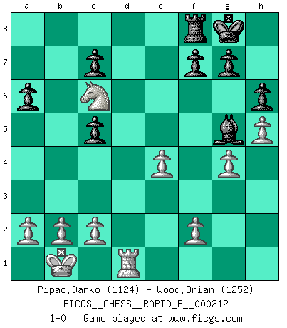 Last move : 1-0 2018 August 1 6:6:36 [Event "FICGS__CHESS__RAPID_E__000212"] [Site "FICGS"] [Date "2018.06.24"] [Round "1"] [White "Pipac,Darko"] [Black "Wood,Brian"] [Result "1-0"] [WhiteElo "1124"] [BlackElo "1252"] 1.e4 e5 2.Nf3 Nc6 3.Bb5 Nf6 4.Nc3 d6 5.Bxc6+ bxc6 6.d3 Bg4 7.h3 Bh5 8.Bg5 Be7 9.Bxf6 Bxf6 10.g4 Bg6 11.h4 h6 12.Qd2 d5 13.O-O-O dxe4 14.Nxe4 Bxe4 15.dxe4 Qxd2+ 16.Rxd2 Rd8 17.Rxd8+ Bxd8 18.Nxe5 c5 19.h5 O-O 20.Nc6 Bg5+ 21.Kb1 a6 22.Rd1 1-0 Ruy Lopez : Berlin defense Queenside Castling by player White (move 13) Kingside Castling by player Black (move 19) Player White won this chess game. Follow this game move after move (download)Robert Fischer is a law unto himself. (Larry Evans) Glücklicherweise sind Großmeister Ruben Fines reine Schachbücher weniger phallozentrisch [als seine Schachpsychologie] und deswegen auch weniger lächerlich. (Nigel Short) ¿Que sería del Ajedrez sin errores graciosos?. (Kurt Richter) Fischer est le meilleur joueur du monde et Karpov n'est qu'un joueur de bistrot. (Garry Kasparov, agé de 16 ans) There is a great deal of difference between an eager man who wants to read a book and a tired man who wants a book to read. (G.K. Chesterton)