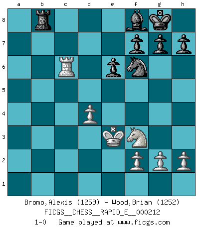 Last move : 1-0 2018 September 18 1:28:35 [Event "FICGS__CHESS__RAPID_E__000212"] [Site "FICGS"] [Date "2018.06.24"] [Round "1"] [White "Bromo,Alexis"] [Black "Wood,Brian"] [Result "1-0"] [WhiteElo "1259"] [BlackElo "1252"] 1.d4 Nf6 2.c4 e6 3.a3 d5 4.e3 Be7 5.Nc3 c6 6.Nf3 O-O 7.c5 b6 8.b4 a5 9.Bb2 axb4 10.axb4 Rxa1 11.Bxa1 bxc5 12.bxc5 Qa5 13.Be2 Ne4 14.Bd3 Nxc3 15.Bxc3 Qxc3+ 16.Ke2 Ba6 17.Qd2 Bxd3+ 18.Qxd3 Qxd3+ 19.Kxd3 Nd7 20.Ra1 Re8 21.Ra6 Bxc5 22.Rxc6 Bf8 23.e4 dxe4+ 24.Kxe4 Nf6+ 25.Kd3 Rb8 26.Ke3 1-0 This chess game has been lost on time (started : 2018.06.24 20:17:55) Queen's pawn game Kingside Castling by player Black (move 6) Player White won this chess game. Follow this game move after move (download)All I want to do, ever, is just play Chess. (Bobby Fischer) Um sich vor der Gefahr einer Erkältung zu schützen, sorge der wanderlustige König beizeiten für ein brauchbares Versteck. (Aaron Nimzowitsch) Yo he agregado estos principios a la ley: pongan los Caballos en acción antes de que los dos Alfiles sean desarrollados. (Emanuel Lasker) Roi des jeux et jeu des rois, les échecs portent en eux un sentiment d'infini. Ils donnent à celui qui s'est efforcé d'en approfondir les arcanes l'impression de n'être pas à la mesure de l'homme; en fait, ils constituent un résumé de l'univers, un microcosme, et figurent cette grande échelle qui, dans les plans de la lumière descend jusqu'à la matière, qui des abîmes insondables remonte jusqu'en l'infini de Dieu. (Pyrame) If you are going through hell, keep going. (Winston Churchill)