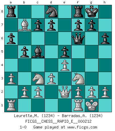 Last move : 1-0 2018 August 6 21:38:9 [Event "FICGS__CHESS__RAPID_E__000212"] [Site "FICGS"] [Date "2018.06.24"] [Round "1"] [White "Leurette,Marc-Antoine"] [Black "Barradas,Anderson"] [Result "1-0"] [WhiteElo "1234"] [BlackElo "1234"] 1.e4 e5 2.Nf3 Nc6 3.Bc4 Bc5 4.O-O Nf6 5.Nc3 O-O 6.d3 a6 7.Bg5 h6 8.Bxf6 Qxf6 9.a3 b5 10.Bd5 Bb7 11.Qe2 Nd8 12.Bxb7 1-0 This chess game has been lost on time (started : 2018.06.24 20:17:55) Giuoco Piano Kingside Castling by player White (move 4) Kingside Castling by player Black (move 5) Player White won this chess game. Follow this game move after move (download)You cannot play at Chess if you are kind-hearted. (French Proverb) Ein Springer auf f6 gegen die eigene Rochadestellung ist schlimmer als ein rostiger Nagel im Knie. (Efim Bogoljubov) Creo que una cierta cantidad de temperamento es esperada de los genios del Ajedrez. (Ron Gross) Il s'avisa de me proposer d'apprendre les échecs qu'il jouait un peu... me voilà forcené des échecs. J'achète un échiquier, je m'enferme dans ma chambre, j'y passe des jours et des nuits à vouloir apprendre par cur toutes les parties. (Jean-Jacques Rousseau, Confessions) Follow your passion, and success will follow you. (Arthur Buddhold)