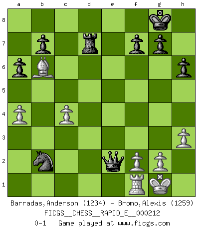 Last move : 0-1 2018 September 16 20:27:33 [Event "FICGS__CHESS__RAPID_E__000212"] [Site "FICGS"] [Date "2018.06.24"] [Round "1"] [White "Barradas,Anderson"] [Black "Bromo,Alexis"] [Result "0-1"] [WhiteElo "1234"] [BlackElo "1259"] 1.e4 e5 2.Nf3 Nc6 3.Bc4 h6 4.O-O Nf6 5.Re1 Bc5 6.d3 O-O 7.a3 a6 8.b4 Bb6 9.Bb2 d6 10.h3 Nd4 11.Nxd4 exd4 12.Nd2 Re8 13.Nf3 c5 14.bxc5 dxc5 15.c3 Be6 16.cxd4 cxd4 17.a4 Bxc4 18.dxc4 Nxe4 19.Qd3 Nc5 20.Rxe8+ Qxe8 21.Nxd4 Nxd3 22.Bc3 Bxd4 23.Bxd4 Rd8 24.Bb6 Rd7 25.Rd1 Qe2 26.Rf1 Nb2 0-1 King's pawn game Kingside Castling by player White (move 4) Kingside Castling by player Black (move 6) Player Black won this chess game. Follow this game move after move (download)We must make sure that Chess will not be like a dead language, very interesting, but for a very small group. (Sytze Faber) Kein Großmeister ist normal. Sie unterscheiden sich nur im Ausmaß Ihrer Verrücktheit. (Viktor Kortschnoi) Con el tiempo, empecé a progresar en partidas decisivas. Tal vez porque me di cuenta de una simple verdad: no solo estaba yo nervioso sino también mi oponente. (Mikhail Tal) Aux échecs, les retours au sommet sont rares : les dommages psychologiques consécutifs à une défaite sont trop sévères. (Daily Telegraph) Memory is a way of holding onto the things you love, the things you are, the things you never want to lose. (from the television show: The Wonder Years)