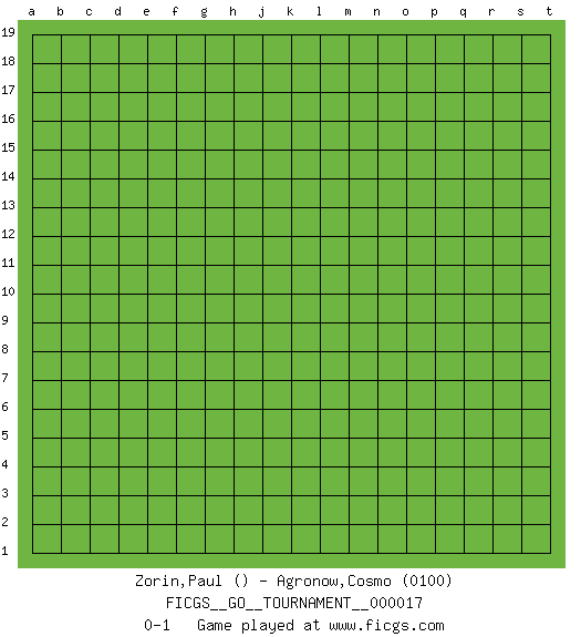 Last move : 0-1 2018 July 28 8:37:40 [Event "FICGS__GO__TOURNAMENT__000017"] [Site "FICGS"] [Date "2018.06.28"] [Round "1"] [Black "Zorin,Paul"] [White "Agronow,Cosmo"] [Result "0-1"] [Rating 2 "0100"] 0-1 This go game has been lost on time (started : 2018.06.28 0:47:24) Here are the names of the openings (joseki) played in the four corners : Player White won this Go (weiqi, baduk) game. Follow this game move after move (download)The saki bottle shape is negative. (Anonymous) The bottom line is always the bottom line. (Johann Piek)