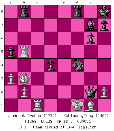 Last move : 0-1 2007 July 27 12:23:19 [Event "FICGS__CHESS__RAPID_C__000031"] [Site "FICGS"] [Date "2007.05.11"] [Round "1"] [White "Woodcock,Graham"] [Black "Kuhlmann,Tony"] [Result "0-1"] [WhiteElo "1270"] [BlackElo "1400"] 1.d4 d5 2.c4 e6 3.c5 g6 4.Nf3 Bg7 5.Nc3 a5 6.g3 b6 7.cxb6 cxb6 8.Nb5 Nf6 9.Nd6+ Qxd6 10.Bf4 Qe7 11.a3 Nc6 12.Qa4 Bb7 13.Ne5 Rc8 14.Bg5 O-O 15.e3 Qd8 16.Nxc6 Bxc6 17.Bb5 Bxb5 18.Qxb5 Qc7 19.O-O Ne4 20.Bf4 Qd8 21.f3 Nd6 22.Qa6 Ra8 23.Qd3 f6 24.e4 Nf7 25.Rac1 e5 26.dxe5 fxe5 27.Be3 d4 28.Bf2 Qd7 29.Qb3 Rab8 30.Rc2 b5 31.Rc5 Kh8 32.Rd5 Qe6 33.Rc1 Ng5 34.f4 exf4 35.gxf4 Nh3+ 36.Kg2 Nxf4+ 37.Kf1 Qxe4 38.Rxb5 Qh1+ 39.Bg1 Qg2+ 0-1 Queen's gambit declined Kingside Castling by player Black (move 14) Kingside Castling by player White (move 19) Player Black won this chess game. Follow this game move after move (download)In a gambit you give up a Pawn for the sake of getting a lost game. (Samuel Standige Boden) Je mehr ich von der FIDE weiss, um so weniger verstehe ich. (Alexander Kalifman) De eso se trata el Ajedrez. Un día le das una lección a tu oponente y al día siguiente el te da una a tí. (Bobby Fischer) Des points faibles ou des trous dans la position de l'adversaire doivent être occupés par des pièces et non pas par des pions. (Siegbert Tarrasch) Life is like a play: it's not the length but the excellence of the acting that matters. (Seneca)