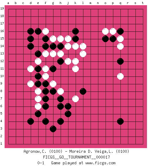 Last move : 0-1 2018 August 11 21:42:13 [Event "FICGS__GO__TOURNAMENT__000017"] [Site "FICGS"] [Date "2018.06.28"] [Round "1"] [Black "Agronow,Cosmo"] [White "Moreira D. Veiga,Ludovic"] [Result "0-1"] [Rating 1 "0100"] [Rating 2 "0100"] 1.q16 k11 2.q4 q10 3.d4 e6 4.f4 g6 5.d16 f16 6.f14 e15 7.d14 e14 8.e13 f13 9.f15 g15 10.g14 g13 11.h14 h15 12.e16 q15 13.o15 p16 14.p15 q14 15.q12 o16 16.k16 j15 17.k15 j14 18.d15 h13 19.j13 k14 20.g11 j12 21.k13 l13 22.j6 h5 23.h4 g4 24.f6 f5 25.f7 e7 26.g3 g5 27.e5 g7 28.f8 e8 29.j5 g9 30.g8 h8 31.f9 f10 32.e9 d9 33.e10 f11 34.e11 e12 35.h7 d11 36.h6 l14 37.h12 k12 38.l8 k7 0-1 Here are the names of the openings (joseki) played in the four corners : Corner d4 : d4 e6 Hoshi (Hwajeom, Seongjeom, Xingwei`) 4-4 Point. The star or hoshi (4-4) point, emphasizing influence at the potential expense of territory. Corner d16 : d16 f16 Hoshi (Hwajeom, Seongjeom, Xingwei`) 4-4 Point. The star or hoshi (4-4) point, emphasizing influence at the potential expense of territory. Ikken Takagakari (Hankan Nop'dakeolch'im, Yi Gaojia, 1-Space High Approach). Black typically responds at 6-4 or 3-10. Black 4-10 is played when Black finds play on the right side advantageous. Black 4-8 or 3-8 may be played when Black has support at top. Corner q16 : q16 q15 Hoshi (Hwajeom, Seongjeom, Xingwei`) 4-4 Point. The star or hoshi (4-4) point, emphasizing influence at the potential expense of territory. Player White won this Go (weiqi, baduk) game. Follow this game move after move (download)More haste less speed. (John Fairbairn) Tomorrow's what you make of it. (Horatio Caine, C.S.I. Miami)