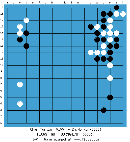 Last move : 1-0 2018 August 22 10:53:42 [Event "FICGS__GO__TOURNAMENT__000017"] [Site "FICGS"] [Date "2018.06.28"] [Round "1"] [Black "Chan,Turtle"] [White "Zh,Mojka"] [Result "1-0"] [Rating 1 "0100"] [Rating 2 "0500"] 1.q16 d17 2.q3 c4 3.d15 c15 4.c14 c16 5.d13 c7 6.r5 r14 7.r12 r10 8.q14 q13 9.r13 q15 10.p14 r15 11.p15 r16 12.q17 r17 13.r18 s18 14.q18 q12 15.q11 p12 16.p11 o12 17.r11 r8 18.s19 t18 19.s14 s15 20.s13 p16 21.o16 1-0 This go game has been lost on time (started : 2018.06.28 0:47:24) Here are the names of the openings (joseki) played in the four corners : Corner d16 : d17 d15 Komoku (Somok, Xiao~mu`) 3-4 Point. The komoku (3-4) point is the traditional corner enclosure move.. Ikken Takagakari (Hankan Nop'dakeolch'im, Yi Gaogua`jiao~, 1-Space High Approach). The 5-4 approach move has become more popular in modern times, as modern Go emphasizes speed and influence. Corner q16 : q16 r14 Hoshi (Hwajeom, Seongjeom, Xingwei`) 4-4 Point. The star or hoshi (4-4) point, emphasizing influence at the potential expense of territory. Ikken Kakari (Hankan Keolch'im, Yi Gua`jiao~, 1-Space Low Approach). White 2 is the standard approach move to the 4-4. Player Black won this Go (weiqi, baduk) game. Follow this game move after move (download)In the opening, when you don't know what to play, make a shimari. (Jansteen) I just play for fun. (Anna Kournikova)