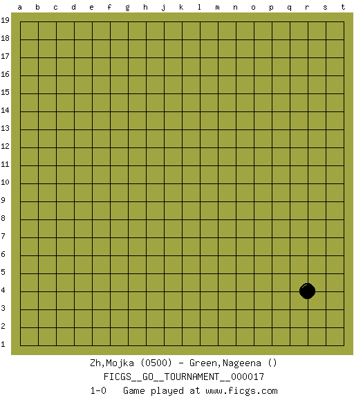 Last move : 1-0 2018 July 28 8:37:40 [Event "FICGS__GO__TOURNAMENT__000017"] [Site "FICGS"] [Date "2018.06.28"] [Round "1"] [Black "Zh,Mojka"] [White "Green,Nageena"] [Result "1-0"] [Rating 1 "0500"] 1.r4 1-0 This go game has been lost on time (started : 2018.06.28 0:47:24) Here are the names of the openings (joseki) played in the four corners : Corner q4 : r4 1-0 Komoku (Somok, Xiao~mu`) 3-4 Point. The komoku (3-4) point is the traditional corner enclosure move.. Player Black won this Go (weiqi, baduk) game. Follow this game move after move (download)Connect with good shape. (Anonymous) Creativity involves breaking out of established patterns in order to look at things in a different way. (Edward De Bono)