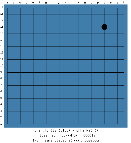 Last move : 1-0 2018 July 28 20:39:15 [Event "FICGS__GO__TOURNAMENT__000017"] [Site "FICGS"] [Date "2018.06.28"] [Round "1"] [Black "Chan,Turtle"] [White "Ekka,Nat"] [Result "1-0"] [Rating 1 "0100"] 1.q16 1-0 This go game has been lost on time (started : 2018.06.28 0:47:24) Here are the names of the openings (joseki) played in the four corners : Player Black won this Go (weiqi, baduk) game. Follow this game move after move (download)Learning josekis by heart is useless if you don't try departing from them. (Pierre Audouard) Art is the only way to run away without leaving home. (Twyla Tharp)