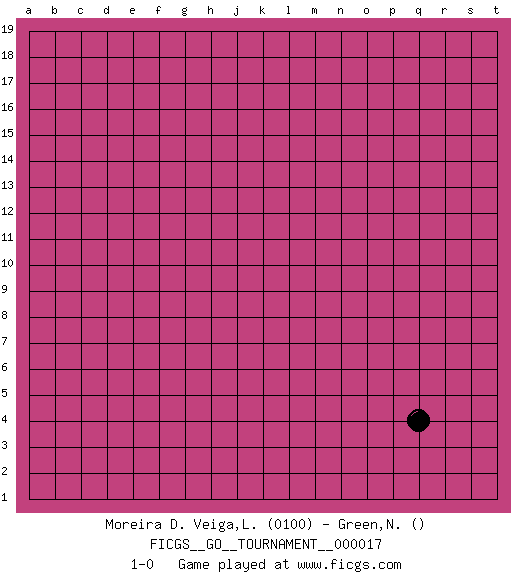 Last move : 1-0 2018 July 29 20:43:20 [Event "FICGS__GO__TOURNAMENT__000017"] [Site "FICGS"] [Date "2018.06.28"] [Round "1"] [Black "Moreira D. Veiga,Ludovic"] [White "Green,Nageena"] [Result "1-0"] [Rating 1 "0100"] 1.q4 1-0 This go game has been lost on time (started : 2018.06.28 0:47:24) Here are the names of the openings (joseki) played in the four corners : Corner q4 : q4 1-0 Hoshi (Hwajeom, Seongjeom, Xingwei`) 4-4 Point. The star or hoshi (4-4) point, emphasizing influence at the potential expense of territory. Player Black won this Go (weiqi, baduk) game. Follow this game move after move (download)The comb formation is alive. (Anonymous) Plans are ideas that never come to fruition. (Daniel Parmet)