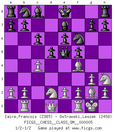 Last move : 1/2-1/2 2007 July 8 15:44:6 [Event "FICGS__CHESS__CLASS_SM__000005"] [Site "FICGS"] [Date "2007.05.11"] [Round "1"] [White "Caire,Francois"] [Black "Ostrowski,Leszek"] [Result "1/2-1/2"] [WhiteElo "2389"] [BlackElo "2458"] 1.d4 f5 2.g3 Nf6 3.Bg2 e6 4.c4 c6 5.Nh3 d5 6.O-O Bd6 7.Bf4 Be7 8.Nd2 Qb6 9.Rb1 Qxd4 10.Be3 Qe5 11.Bf4 Qd4 12.Be3 Qe5 13.Bf4 1/2-1/2 Dutch defense Kingside Castling by player White (move 6) This chess game ended in a draw. Follow this game move after move (download)The Chess pieces are the block alphabet which shapes thoughts; and these thoughts, although making a visual design on the chessboard, express their beauty abstractly, like a poem. (Marcel Duchamp) Aljechin war kein Nazi. Er war ein Opportunist. Ein schrecklicher Mann. Er liebte Geld über alles und würde für Geld ein Jude, ein Katolik oder ein Protestant werden. (Miguel Najdorf) Cuando veas una buena jugada, trata de encontrar otra mejor. (Emanuel Lasker) Karpov est une pièce de musée. (Garry Kasparov) A good player is always lucky. (Capablanca)