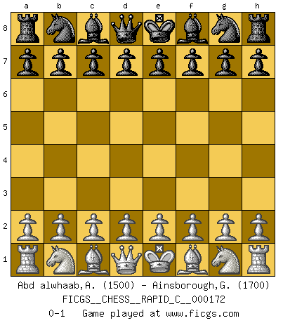 Last move : 0-1 2018 July 28 20:39:15 [Event "FICGS__CHESS__RAPID_C__000172"] [Site "FICGS"] [Date "2018.06.28"] [Round "1"] [White "Abd alwhaab,Ahmed Adly"] [Black "Ainsborough,Gregory"] [Result "0-1"] [WhiteElo "1500"] [BlackElo "1700"] 0-1 This chess game has been lost on time (started : 2018.06.28 12:11:2) Player Black won this chess game. Follow this game move after move (download)Though most people love to look at the games of the great attacking masters, some of the most successful players in history have been the quiet positional players. They slowly grind you down by taking away your space, tying up your pieces, and leaving you with virtually nothing to do ! (Yasser Seirawan) Sitze auf Deine Hände. (Siegbert Tarrasch) El Ajedrez es en su esencia, un juego. En su forma, un arte. Y en su ejecución, una ciencia. (Baron Tassilo) Le succès, c'est être capable d'aller d'échec en échec sans perdre son enthousiasme. (Winston Churchill) A woman without a man is like a fish without a bicycle. (Gloria Steinem)