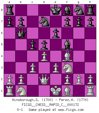 Last move : 0-1 2018 August 10 21:59:20 [Event "FICGS__CHESS__RAPID_C__000172"] [Site "FICGS"] [Date "2018.06.28"] [Round "1"] [White "Ainsborough,Gregory"] [Black "Perez,Alberto"] [Result "0-1"] [WhiteElo "1700"] [BlackElo "1774"] 1.d4 d5 2.Bf4 Bf5 3.e3 Nd7 4.c3 c5 5.Nf3 Qb6 6.Qd2 e6 0-1 This chess game has been lost on time (started : 2018.06.28 12:11:2) Queen's pawn, Mason variation Player Black won this chess game. Follow this game move after move (download)It's always better to sacrifice your opponent's men. (Savielly Tartakover) Auf Remis zu spielen ist gewissermaßen ein Verbrechen gegen das Schachspiel. (Mikhail Nekhemyevich Tal) La caracteristica mas importante en la posición del Ajedrez es la actividad de las piezas. Esto es absolutamente fundamental en todas las fases del juego: Apertura, Juego Medio y especialmente Finales. La limitación primordial en la actividad de una pieza, es la estructuración de los Peones. (Michael Stean) C'est une question de caractère, Beaucoup de gens perdent leur motivation très vite. D'autres, ils sont rares, peuvent la conserver très longtemps. J'aime les échecs, encore aujourd'hui je suis heureux d'analyser des parties. J'aime toujours gagner, je déteste encore perdre. Bien jouer est important pour mon intégrité intellectuelle et morale. Et puis les échecs vivent en ce moment une période historique grâce à Internet. Ils se développent dans les systèmes éducatifs à travers le monde. Ils sortent de leur ghetto, et c'est mon rôle de mener à bien cette révolution. (Gary Kasparov) The human is the only animal species whose members are able to talk themselves into difficulties that would not otherwise exist. (Wendell Johnson)