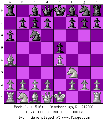 Last move : 1-0 2018 August 22 10:53:42 [Event "FICGS__CHESS__RAPID_C__000172"] [Site "FICGS"] [Date "2018.06.28"] [Round "1"] [White "Pech,Jaroslav"] [Black "Ainsborough,Gregory"] [Result "1-0"] [WhiteElo "1516"] [BlackElo "1700"] 1.e4 e5 2.Nf3 Nc6 3.Bb5 a6 4.Ba4 1-0 This chess game has been lost on time (started : 2018.06.28 12:11:2) Ruy Lopez Player White won this chess game. Follow this game move after move (download)I prefer to lose a really good game than to win a bad one. (David Levy) Alle Schachspieler sollten auch ein Hobby haben. (Savielly Grigorievitsch Tartakower) No hay precio que sea tan grande por la cabellera del Rey enemigo. (Koblentz) Si je n'étais pas joueur d'échecs, je serais le meilleur dans quelque chose d'autre. (Anatoli Karpov) The Internet isn't free. It just has an economy that makes no sense to capitalism. (Brad Shapcott)