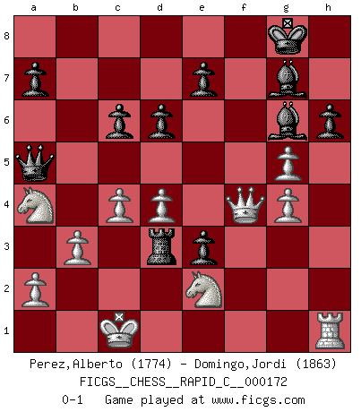 Last move : 0-1 2018 September 3 23:50:58 [Event "FICGS__CHESS__RAPID_C__000172"] [Site "FICGS"] [Date "2018.06.28"] [Round "1"] [White "Perez,Alberto"] [Black "Domingo,Jordi"] [Result "0-1"] [WhiteElo "1774"] [BlackElo "1863"] 1.c4 g5 2.e4 d6 3.d4 h6 4.Nc3 Bg7 5.Be3 Nf6 6.Bd3 Ng4 7.Nge2 c5 8.h3 Nxe3 9.fxe3 Nc6 10.Bc2 cxd4 11.exd4 Qb6 12.Ba4 O-O 13.Bxc6 bxc6 14.Qd2 Rb8 15.b3 f5 16.O-O-O fxe4 17.Rdf1 Bf5 18.g4 Bg6 19.Rxf8 Rxf8 20.h4 Rf3 21.hxg5 Rd3 22.Qf4 Qa5 23.Na4 e3 0-1 English Opening Kingside Castling by player Black (move 12) Queenside Castling by player White (move 16) Player Black won this chess game. Follow this game move after move (download)I played Chess with him and would have beaten him sometimes only he always took back his last move, and ran the game out differently. (Mark Twain) Wenn Du einsam bist, wenn Du Dich in der Welt wie ein Fremder fühlst, spiele Schach. Das wird Deinen Geist erheben und Dein Ratgeber im Kampf sein. (Aristoteles) Siempre es mucho mejor sacrificar las piezas de tu oponente. (Savielly Tartakover) Votre seul travail dans les ouvertures est d'obtenir un milieu de partie jouable. (Lajos Portish) The absolute truth is the thing that makes people laugh. (Carl Reiner)