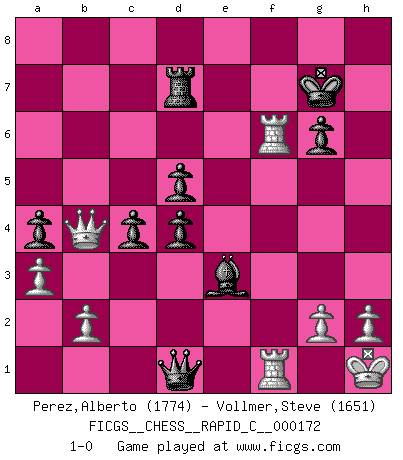 Last move : 1-0 2018 September 1 12:1:0 [Event "FICGS__CHESS__RAPID_C__000172"] [Site "FICGS"] [Date "2018.06.28"] [Round "1"] [White "Perez,Alberto"] [Black "Vollmer,Steve"] [Result "1-0"] [WhiteElo "1774"] [BlackElo "1651"] 1.c4 e5 2.Nc3 Nf6 3.e4 Nc6 4.a3 b6 5.d3 Bb7 6.Nf3 Be7 7.Be2 O-O 8.O-O a5 9.Nd5 d6 10.Be3 a4 11.Ne1 Nd4 12.Nxf6 Bxf6 13.Bxd4 exd4 14.Nc2 c5 15.f4 b5 16.Ne1 bxc4 17.Bf3 cxd3 18.Nxd3 Be7 19.Qc2 Qb6 20.Rac1 Rfc8 21.e5 Bxf3 22.Rxf3 d5 23.Rh3 g6 24.f5 Bg5 25.Rf1 c4 26.e6 Ra7 27.Kh1 Qb3 28.Qe2 Be3 29.Ne5 f6 30.Nd7 Qd3 31.Qe1 Kg7 32.fxg6 hxg6 33.Rxf6 Rxd7 34.exd7 Rd8 35.Rhf3 Rxd7 36.Qb4 Qd1+ 37.Rf1 1-0 English Opening Kingside Castling by player Black (move 7) Kingside Castling by player White (move 8) Player White won this chess game. Follow this game move after move (download)The winner of the game is the player who makes the next-to-last mistake. (Savielly Tartakover) Verschiedene, sehr schätzbare und im Laufe des Lebens nützliche Eigenschaften des Geistes können durch das Schachspiel erworben und gekräftigt werden, so dass sie zu Gewohnheiten werden, die uns nie im Stich lassen. (Benjamin Franklin) Algunos sacrificios son sólidos, los demás son míos. (Mikhail Tal) Même un GMI sait rarement calculer sur plus de cinq coups une attaque à sacrifices. (Rudolf Spielmann) Heh, heh, heh. Time to abandon ship. (General Grievous in Star Wars ep.3)
