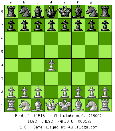 Last move : 1-0 2018 July 28 20:39:15 [Event "FICGS__CHESS__RAPID_C__000172"] [Site "FICGS"] [Date "2018.06.28"] [Round "1"] [White "Pech,Jaroslav"] [Black "Abd alwhaab,Ahmed Adly"] [Result "1-0"] [WhiteElo "1516"] [BlackElo "1500"] 1.d4 1-0 This chess game has been lost on time (started : 2018.06.28 12:11:2) Queen's pawn Player White won this chess game. Follow this game move after move (download)Every Pawn is a potential Queen. (James Mason) Zum Sieg gelangt man nicht, wenn man gut, sondern nur wenn man besser spielt (Savielly Grigorievitsch Tartakower) Aquel que ve no otra dirección en el juego que la de dar Jaque Mate a su oponente, nunca será un buen jugador de Ajedrez. (Euwe) On croit qu'il y a plus de mauvais joueurs que de bons joueurs, c'est faux : Il y a autant de joueurs qui gagnent que de joueurs qui perdent. (Philippe Geluck) O divine art of subtlety and secrecy! Through you we learn to be invisible, through you inaudible and hence we can hold the enemy's fate in our hands. (Sun Tzu)