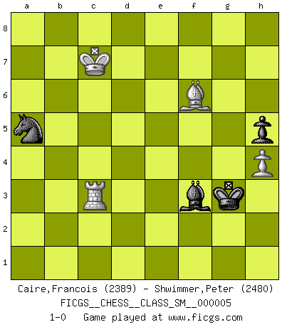 Last move : 1-0 2008 May 14 7:18:51 [Event "FICGS__CHESS__CLASS_SM__000005"] [Site "FICGS"] [Date "2007.05.11"] [Round "1"] [White "Caire,Francois"] [Black "Shwimmer,Peter"] [Result "1-0"] [WhiteElo "2389"] [BlackElo "2480"] 1.Nf3 c5 2.g3 Nf6 3.c4 d5 4.d4 dxc4 5.Qa4+ Nc6 6.dxc5 e6 7.Bg2 Bxc5 8.O-O O-O 9.Qxc4 Be7 10.Nc3 e5 11.Be3 Qa5 12.Ng5 Nd4 13.a3 Bg4 14.b4 Qb6 15.h3 Bh5 16.Na4 Nxe2+ 17.Kh2 Qd6 18.Nc5 Nd4 19.Rae1 b5 20.Qa2 Rac8 21.f4 exf4 22.Rxf4 Nc6 23.Nge4 Nxe4 24.Rxe4 Qd8 25.Bf4 Bg6 26.R4e2 Bxc5 27.bxc5 Nd4 28.Rd2 Qa5 29.Bd6 Rfd8 30.Red1 Ne6 31.Bb7 h5 32.h4 Qc3 33.Bxc8 Rxc8 34.Qb2 Qc4 35.Rc1 Qe4 36.Qe5 a5 37.Qxe4 Bxe4 38.Re1 f5 39.Rc1 Kf7 40.Bf4 Rxc5 41.Rxc5 Nxc5 42.Rd6 Nd3 43.Rb6 b4 44.axb4 axb4 45.Bd6 Ne1 46.Kg1 Nf3+ 47.Kf2 Nd4 48.Bxb4 Ne6 49.Ra6 Bd3 50.Ra7+ Kg6 51.Bd6 Kf6 52.Ba3 Kg6 53.Ke3 Bf1 54.Bb2 Bc4 55.Re7 Kh7 56.Kd2 Kg6 57.Be5 Bd5 58.Kc3 Kh7 59.Rd7 Ba2 60.Ra7 Bd5 61.Ra5 Bf3 62.Ra6 Bd5 63.Rd6 Ba2 64.Rd2 Bb1 65.Kc4 Kg6 66.Kd5 Nd8 67.Bc3 Be4+ 68.Kd6 Nb7+ 69.Ke7 f4 70.gxf4 Kf5 71.Bxg7 Kxf4 72.Rb2 Na5 73.Rb5 Nc6+ 74.Ke6 Bf3 75.Kd7 Kg3 76.Bf6 Kf2 77.Kc7 Kg2 78.Rb2+ Kg3 79.Rb3 Na5 80.Rc3 1-0 Reti Opening Kingside Castling by player White (move 8) Kingside Castling by player Black (move 8) 10 pieces endgame at move 70 : White KRBPP , Black KBNPP WHITE : King + 1 Rook 1 Bishop 2 Pawns BLACK : King + 1 Bishop 1 Knight 2 Pawns 9 pieces endgame at move 71 : White KRBPP , Black KBNP WHITE : King + 1 Rook 1 Bishop 2 Pawns BLACK : King + 1 Bishop 1 Knight 1 Pawn 8 pieces endgame at move 71 : White KRBP , Black KBNP WHITE : King + 1 Rook 1 Bishop 1 Pawn BLACK : King + 1 Bishop 1 Knight 1 Pawn Player White won this chess game. Follow this game move after move (download)During a Chess competition a Chessmaster should be a combination of a beast of prey and a monk. (Alexander Alekhine) Ich verachte Kasparow. (Viktor Kortschnoi) En el tablero, la mentira e hipocresía no sobreviven mucho. (Emanuel Lasker) Les Echecs représentent une sphère d'idées créatrices basée sur la volonté des deux protagonistes. (Smyslov) There are more things in heaven and earth than practically anywhere else. (Unknown)