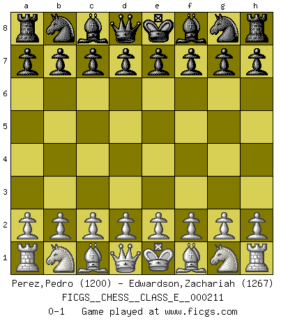 Last move : 0-1 2018 August 9 21:57:8 [Event "FICGS__CHESS__CLASS_E__000211"] [Site "FICGS"] [Date "2018.06.30"] [Round "1"] [White "Perez,Pedro"] [Black "Edwardson,Zachariah"] [Result "0-1"] [WhiteElo "1200"] [BlackElo "1267"] 0-1 This chess game has been lost on time (started : 2018.06.30 14:58:40) Player Black won this chess game. Follow this game move after move (download)I have added these principles to the law: get the Knights into action before both Bishops are developed. (Emanuel Lasker) Schach ist ein Reich, wo sich die menschliche Phantasie frei entfalten kann. (David Bronstein) El Ajedrez lo es todo: arte, ciencia y deporte. (Anatoly Karpov) Aux échecs, l'amour-propre est satisfait quand on remporte la victoire, mais il n'y a pas de honte à être battu. (Benjamin Franklin) There are two types of people in this world, good and bad. The good sleep better, but the bad seem to enjoy the waking hours much more. (Woody Allen)