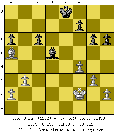 Last move : 1/2-1/2 2018 September 26 16:29:59 [Event "FICGS__CHESS__CLASS_E__000211"] [Site "FICGS"] [Date "2018.06.30"] [Round "1"] [White "Wood,Brian"] [Black "Plunkett,Louis"] [Result "1/2-1/2"] [WhiteElo "1252"] [BlackElo "1498"] 1.e4 c5 2.Nf3 Nc6 3.b3 e6 4.Bb2 Nf6 5.e5 Nd5 6.c4 Nde7 7.d4 cxd4 8.Nxd4 Qa5+ 9.Qd2 Qxe5+ 10.Be2 Nxd4 11.Bxd4 Qc7 12.Nc3 a6 13.Bf3 Nf5 14.Rd1 e5 15.Qe2 d6 16.Nd5 Qa5+ 17.Bc3 Qd8 18.O-O Be7 19.c5 O-O 20.Nxe7+ Qxe7 21.cxd6 Nxd6 22.Qxe5 Qxe5 23.Bxe5 Nf5 24.Bc7 Ne7 25.Rd8 Rxd8 26.Bxd8 Nc6 27.Bxc6 bxc6 28.Re1 Be6 29.Ba5 Rc8 30.Rd1 h6 31.Rd8+ Rxd8 32.Bxd8 Kf8 33.Ba5 Ke8 34.f4 g6 35.g3 Bd5 36.Kf2 1/2-1/2 Sicilian defense Kingside Castling by player White (move 18) Kingside Castling by player Black (move 19) This chess game ended in a draw. Follow this game move after move (download)Let the perfectionist play postal. (Yasser Seirawan) Es gibt zwei Arten von Opfern: Korrekte und meine. (Mikhail Nekhemyevich Tal) Todos los jugadores de Ajedrez deberían tener un pasatiempo. (Savielly Tartakower) Une platitude souvent récitée à propos des Echecs est qu'une des choses les plus difficiles à réaliser est de gagner une position gagnante. Cela ne manque pas de sens mais, pour ma part, j'ai toujours trouvé plus difficile de gagner une position perdante. (Tim Krabbe) Luck is what you have left over after you give 100 percent. (Langston Coleman)