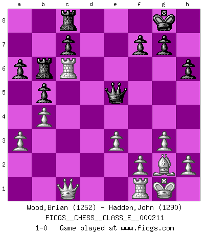 Last move : 1-0 2018 September 2 13:29:26 [Event "FICGS__CHESS__CLASS_E__000211"] [Site "FICGS"] [Date "2018.06.30"] [Round "1"] [White "Wood,Brian"] [Black "Hadden,John"] [Result "1-0"] [WhiteElo "1252"] [BlackElo "1290"] 1.Nf3 d5 2.g3 Nf6 3.Bg2 Nc6 4.d4 e6 5.Bg5 Be7 6.O-O h6 7.Bxf6 Bxf6 8.e3 Bd7 9.Nbd2 Qe7 10.c4 O-O 11.Ne1 Nb4 12.a3 Nc6 13.b4 dxc4 14.Nxc4 a6 15.Nd3 b5 16.Nce5 Qd8 17.Nxc6 Bxc6 18.Bxc6 Rb8 19.Rc1 Rb6 20.Rc3 Qd6 21.Bg2 e5 22.dxe5 Bxe5 23.Nxe5 Qxe5 24.Qc1 Rc8 25.Rc6 1-0 Reti : King's Indian attack (Barcza system) Kingside Castling by player White (move 6) Kingside Castling by player Black (move 10) Player White won this chess game. Follow this game move after move (download)The passion for playing Chess is one of the most unaccountable in the world. (H.G. Wells) Den Ruhm habe ich schon, jetzt brauche ich noch das Geld. (Wilhelm Steinitz) Fischer era un maestro de claridad y un Rey del posicionamiento astuto. Sus oponentes podían ver hacia donde se dirigía pero eran impotentes para detenerlo. (Bruce Pandolfini) Votre seul travail dans les ouvertures est d'obtenir un milieu de partie jouable. (Lajos Portish) Unless in communicating with it one says exactly what one means, trouble is bound to result. (Alan Turing, about computers)