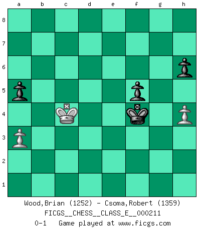 Last move : 0-1 2018 October 7 1:5:15 [Event "FICGS__CHESS__CLASS_E__000211"] [Site "FICGS"] [Date "2018.06.30"] [Round "1"] [White "Wood,Brian"] [Black "Csoma,Robert"] [Result "0-1"] [WhiteElo "1252"] [BlackElo "1359"] 1.d4 Nf6 2.Nf3 d5 3.c4 c6 4.Nc3 e6 5.Bg5 h6 6.Bh4 Be7 7.e3 O-O 8.Bd3 Nbd7 9.O-O dxc4 10.Bxc4 Nb6 11.Bd3 Nfd5 12.Bxe7 Qxe7 13.Rc1 Bd7 14.Nxd5 exd5 15.b3 Rac8 16.Ne5 Be6 17.e4 dxe4 18.Bxe4 Nd5 19.Bxd5 Bxd5 20.Nf3 Qf6 21.Ne5 Qg5 22.Qg4 Qxg4 23.Nxg4 Rfe8 24.Rfe1 Re6 25.Rxe6 Bxe6 26.Ne3 Rd8 27.Rd1 f6 28.f3 Kf7 29.Nc2 c5 30.d5 Rxd5 31.Rxd5 Bxd5 32.Ne3 Be6 33.Kf2 b5 34.Ke2 Ke7 35.Kd3 Kd6 36.f4 g6 37.h3 a5 38.g4 f5 39.gxf5 Bxf5+ 40.Nxf5+ gxf5 41.h4 Kd5 42.a3 c4+ 43.bxc4+ bxc4+ 44.Kc3 Ke4 45.Kxc4 Kxf4 0-1 Queen's pawn game Kingside Castling by player Black (move 7) Kingside Castling by player White (move 9) 10 pieces endgame at move 43 : White KPPPP , Black KPPPP WHITE : King + 4 Pawns BLACK : King + 4 Pawns 9 pieces endgame at move 43 : White KPPP , Black KPPPP WHITE : King + 3 Pawns BLACK : King + 4 Pawns 8 pieces endgame at move 45 : White KPPP , Black KPPP WHITE : King + 3 Pawns BLACK : King + 3 Pawns 7 pieces endgame at move 45 : White KPP , Black KPPP WHITE : King + 2 Pawns BLACK : King + 3 Pawns Player Black won this chess game. Follow this game move after move (download)Avoid the crowd. Do your own thinking independently. Be the Chess player, not the Chess piece. (Ralph Charell) Schach ist mein Leben, meine Leidenschaft, was ich gelernt habe und seit meinem 14. Lebensjahr profimässig praktiziere. Darauf zu verzichten, würde mir sehr schwer fallen. (Viktor Kortschnoi) Algunos sacrificios son sólidos, los demás son míos. (Mikhail Tal) D'abord les bases : Jouez et étudiez, puis étudiez et jouez, ensuite jouez et étudiez, puis étudiez et jouez. Deuxièmement : Donnez toujours le meilleur de vous-même ! (Ken Smith) Don't be irreplaceable, if you can't be replaced, you can't be promoted. (Dan Rotaru)