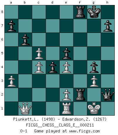 Last move : 0-1 2018 September 7 15:47:57 [Event "FICGS__CHESS__CLASS_E__000211"] [Site "FICGS"] [Date "2018.06.30"] [Round "1"] [White "Plunkett,Louis"] [Black "Edwardson,Zachariah"] [Result "0-1"] [WhiteElo "1498"] [BlackElo "1267"] 1.c4 Nf6 2.g3 e6 3.Bg2 d5 4.Nf3 Be7 5.O-O O-O 6.b3 b6 7.Bb2 Bb7 8.d3 c5 9.Ne5 Nbd7 10.f4 Nxe5 11.fxe5 Ng4 12.Bc1 Bg5 13.Bxg5 Qxg5 14.Qd2 Qxe5 15.Nc3 Ne3 16.Rf3 d4 17.Nd1 Nxg2 18.Kxg2 Qh5 19.Nf2 f5 20.Re1 g5 21.Kg1 g4 22.Rf4 e5 23.Rxg4+ fxg4 24.Ne4 Bxe4 25.dxe4 Qg6 26.Qc2 Rf7 27.a3 Raf8 28.b4 Rf2 29.Qb1 Qh6 30.bxc5 Qxh2+ 0-1 English, 1...Nf6 (Anglo-Indian defense) Kingside Castling by player White (move 5) Kingside Castling by player Black (move 5) Player Black won this chess game. Follow this game move after move (download)Fischer is an American Chess tragedy on par with Morphy and Pillsbury. (Mig Greengard) Oft bringt ein stiller Zug das Erdbeben. (Richard Reti) Tu no necesitas jugar muy bien, únicamente ayudar a tu oponenet a que juegue muy mal. (Genrikh Chepukaitis) Un journaliste : 'Vous préférez avoir une dame de plus sur l'échiquier ou au lit ?' Boris Spassky : 'Ca dépend de la position.' A good teacher is like a candle - it consumes itself to light the way for others. (Author unknown)