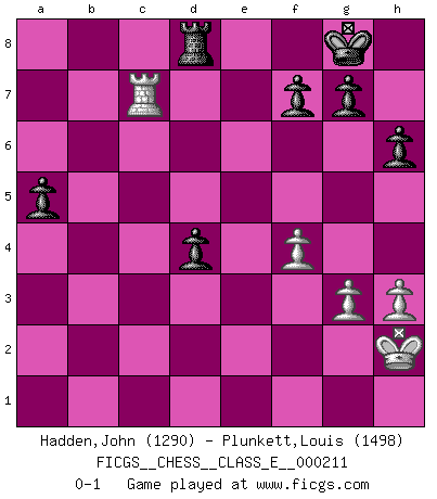 Last move : 0-1 2018 August 20 12:8:37 [Event "FICGS__CHESS__CLASS_E__000211"] [Site "FICGS"] [Date "2018.06.30"] [Round "1"] [White "Hadden,John"] [Black "Plunkett,Louis"] [Result "0-1"] [WhiteElo "1290"] [BlackElo "1498"] 1.d4 d5 2.c4 Nc6 3.Nf3 Bg4 4.h3 Bxf3 5.gxf3 e6 6.cxd5 exd5 7.Nc3 Nf6 8.Bg5 Be7 9.f4 h6 10.Bh4 Bb4 11.Bg2 Qd6 12.Bg3 Ne4 13.O-O Nxg3 14.fxg3 Bxc3 15.bxc3 Na5 16.Qa4+ Nc6 17.Qb5 O-O 18.Qxd5 Qg6 19.Rf3 Qc2 20.Re3 Rfe8 21.Qf3 Na5 22.Rxe8+ Rxe8 23.Kf2 Qb2 24.Qd5 Qxe2+ 25.Kg1 Qe3+ 26.Kh2 Qxc3 27.Rf1 Nc6 28.Qd7 Rd8 29.Qg4 Qxd4 30.Bxc6 bxc6 31.Qf3 Qc4 32.Re1 Qxa2+ 33.Re2 Qc4 34.Qg2 a5 35.Rc2 Qd5 36.Qxd5 cxd5 37.Rxc7 d4 0-1 QGD : Chigorin defense Kingside Castling by player White (move 13) Kingside Castling by player Black (move 17) Player Black won this chess game. Follow this game move after move (download)One bad move nullifies forty good ones. (Horowitz) Nicht daß Diemer aus Opportunismus Mitglied der NSDAP geworden wäre. Er war ein Fanatiker, in allem, was er tat. (Hans Ree) El Ajedrez es parte de una cultura y si una cultura esta en decadencia, entonces también el Ajedrez declinará. (Mikhail Botvinnik) Les échecs, c'est la lutte contre l'erreur. (Johannes Zukertort) Your best chance to get a Royal Flush in a casino is in the bathroom. (Anonymous)