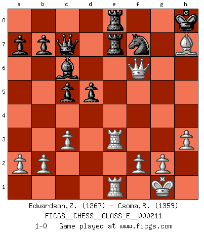 Last move : 1-0 2018 August 7 22:23:58 [Event "FICGS__CHESS__CLASS_E__000211"] [Site "FICGS"] [Date "2018.06.30"] [Round "1"] [White "Edwardson,Zachariah"] [Black "Csoma,Robert"] [Result "1-0"] [WhiteElo "1267"] [BlackElo "1359"] 1.d4 Nf6 2.Nf3 d5 3.Bf4 c5 4.e3 Nc6 5.c3 e6 6.Nbd2 Bd6 7.Ne5 O-O 8.h3 Bxe5 9.dxe5 Nd7 10.Nf3 Qc7 11.Bd3 h6 12.O-O Ndxe5 13.Nxe5 Nxe5 14.e4 Bd7 15.exd5 exd5 16.Bc2 Rfe8 17.Re1 Bc6 18.Re3 Re7 19.Qh5 Rae8 20.Rae1 f6 21.Bxh6 gxh6 22.Qxh6 Nf7 23.Bh7+ Kh8 24.Qxf6+ 1-0 Queen's pawn game Kingside Castling by player Black (move 7) Kingside Castling by player White (move 12) Player White won this chess game. Follow this game move after move (download)When you don't know what to do, wait for your opponent to get an idea - it's sure to be wrong. (Tarrasch) Rauchen ist dem Schachspieler bei seiner Arbeit, also im Wettkampf, untersagt. (Viktor Kortschnoi) El Ajedrez lo es todo: arte, ciencia y deporte. (Anatoly Karpov) Un millionnaire : 'Monsieur Steinitz ! Vous ne participez aux tournois que pour l'argent, alors que moi je n'y viens que pour l'honneur.' Steinitz : 'Chacun joue pour ce qu'il n'a pas'... Beta. Software undergoes beta testing shortly before it's released. Beta is latin for still doesn't work. (Anonymous)
