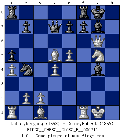 Last move : 1-0 2018 September 22 12:16:39 [Event "FICGS__CHESS__CLASS_E__000211"] [Site "FICGS"] [Date "2018.06.30"] [Round "1"] [White "Kohut,Gregory"] [Black "Csoma,Robert"] [Result "1-0"] [WhiteElo "1593"] [BlackElo "1359"] 1.e4 d6 2.d4 Nf6 3.Nc3 g6 4.f4 Bg7 5.Nf3 O-O 6.e5 dxe5 7.fxe5 Nd5 8.Bc4 c6 9.O-O Bf5 10.Qe2 a6 11.a4 a5 12.h3 h5 13.Ng5 Qd7 14.g4 hxg4 15.hxg4 Bxg4 16.Qe4 Na6 17.Nxd5 cxd5 18.Bxd5 Nb4 19.Qxg6 1-0 Pirc : Austrian attack, 6.e5 Kingside Castling by player Black (move 5) Kingside Castling by player White (move 9) Player White won this chess game. Follow this game move after move (download)A win by an unsound combination, however showy, fills me with artistic horror. (Wilhelm Steinitz) Sehr viele beherrschen heutzutage das große Einmalseins des Schachspiels und kennen sogar dessen Logarithmentafeln auswendig - deshalb sollte man hin und wieder zu beweisen trachten, dass zwei mal zwei auch fünf sein kann. (Mikhail Nekhemyevich Tal) Ser exitoso en el Ajedrez te permite descubrir tu propia personalidad. Eso es lo que deseo para los niños de mi clase. (Saudin Robovic) Il vaut mieux sacrifier les pièces de l'adversaire. (Xavier Tartacover) Now you put water in a cup, it becomes the cup; You put water into a bottle it becomes the bottle; You put it in a teapot it becomes the teapot. Water can flow or it can crash. Be water, my friend. (Bruce Lee)
