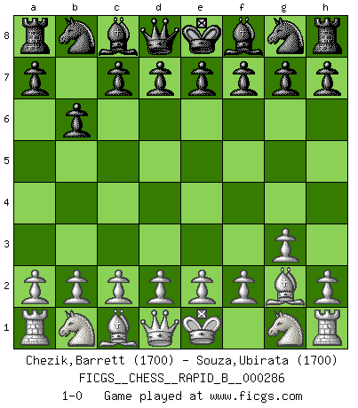Last move : 1-0 2018 August 2 8:57:20 [Event "FICGS__CHESS__RAPID_B__000286"] [Site "FICGS"] [Date "2018.07.01"] [Round "1"] [White "Chezik,Barrett"] [Black "Souza,Ubirata"] [Result "1-0"] [WhiteElo "1700"] [BlackElo "1700"] 1.g3 b6 2.Bg2 1-0 This chess game has been lost on time (started : 2018.07.01 11:4:32) Benko's Opening Player White won this chess game. Follow this game move after move (download)It is always better to sacrifice your opponent's men. (Savielly Tartakower) Mein Gehirn das ist mein zweitwichtigstes Organ [Aus dem Film: Der Schläfer]. (Woody Allen) ¡Examina movidas que hagan daño! Un buen ojo for movidas desvastantes es mucho mas importante que el conocimiento de principios estratégicos. (Purdy) Les échecs sont un jeu terrible. Si vous n'avez pas le centre, votre adversaire a une position plus libre. Par contre, si vous avez le centre, alors vous avez vraiment quelque chose pour laquelle vous inquiéter ! (Siegbert Tarrasch) Tree pose grows confidence. It roots me to this world. (Terri Guillemets)